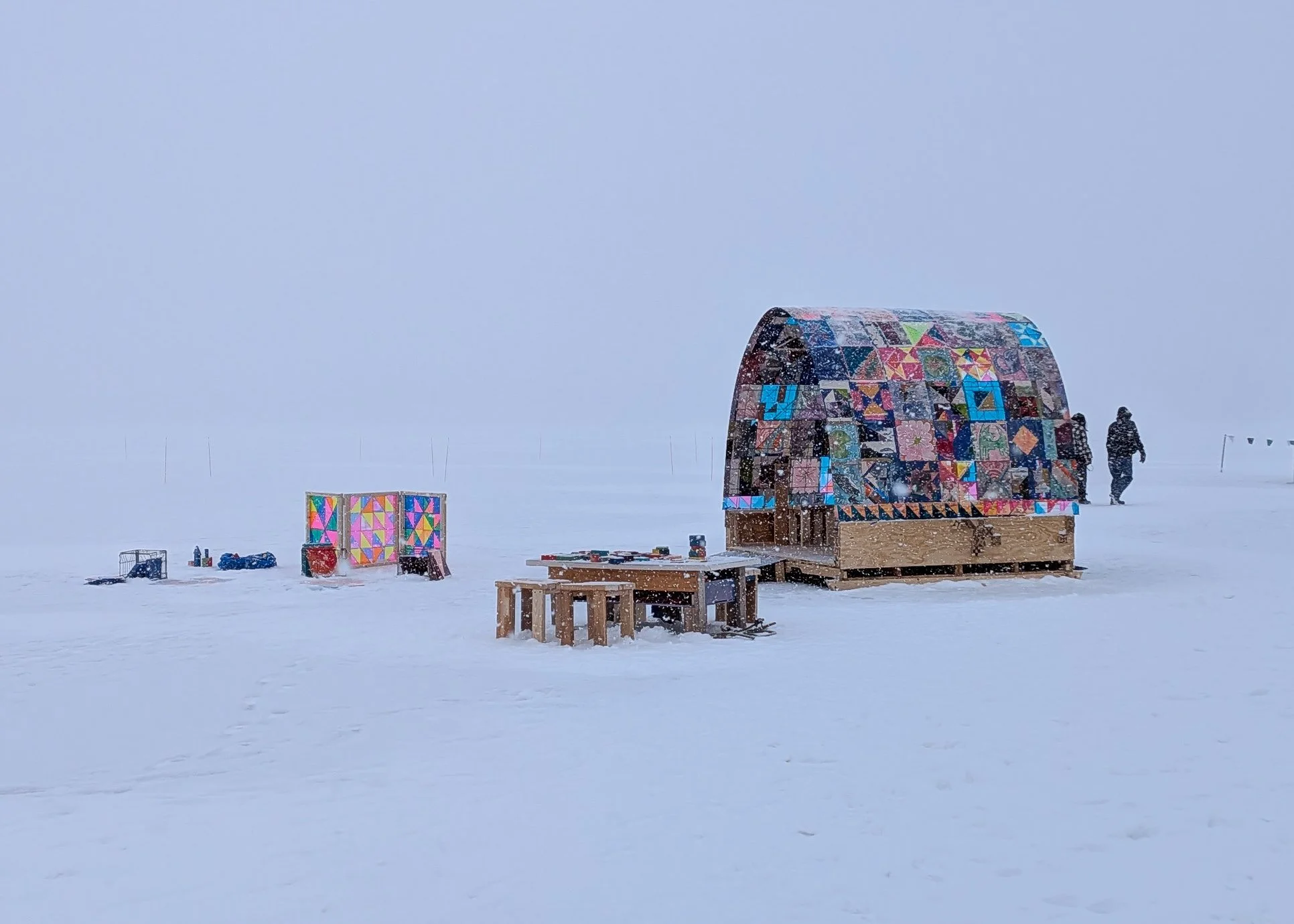 Quilt Shanty is a collaborative public art installation by Madeline Cochrane and Emily Quandahl that reimagines a hoop house as a winter gathering space on the frozen lake. Wrapped in a quilted covering, the structure takes a literal approach to the idea of a barn quilt: a tactile textile quilt stretched over an agricultural form.
