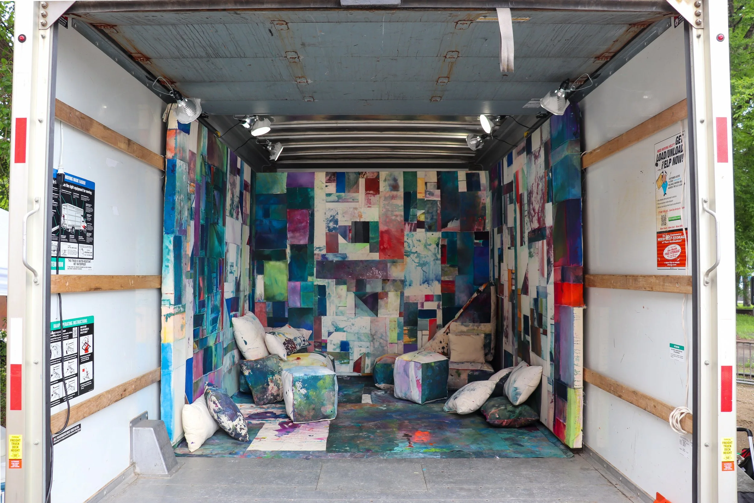 The Back is an installation by Emily Quandahl that transforms the interior of a U-Haul truck into a soft-walled environment made from cut and hand-stitched paintings. The walls, floor, seating, and pillows are covered in reassembled fragments of past works, creating a space built entirely from painted material.
